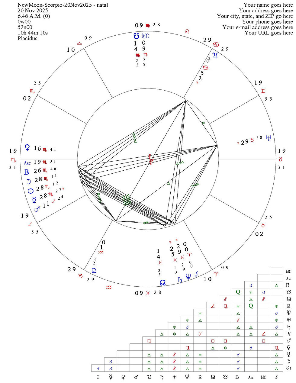 The New Moon in Scorpio of November 20, 2025, is a symphony of rebirth where every aspect of the chart calls for the courage to transform emotional density into luminous awareness. It is both mystic and pragmatic: a lunar architecture that invites us to own our shadows, heal our lineage, and build a new economy of heart and spirit. Under this sky, power is not dominance; it is integration. Wealth is not accumulation; it is flow. And healing is not escape; it is participation in life’s endless cycle of creation, death, and resurrection. The message from the stars is clear: the soul that dares to evolve now becomes the architect of the future.
